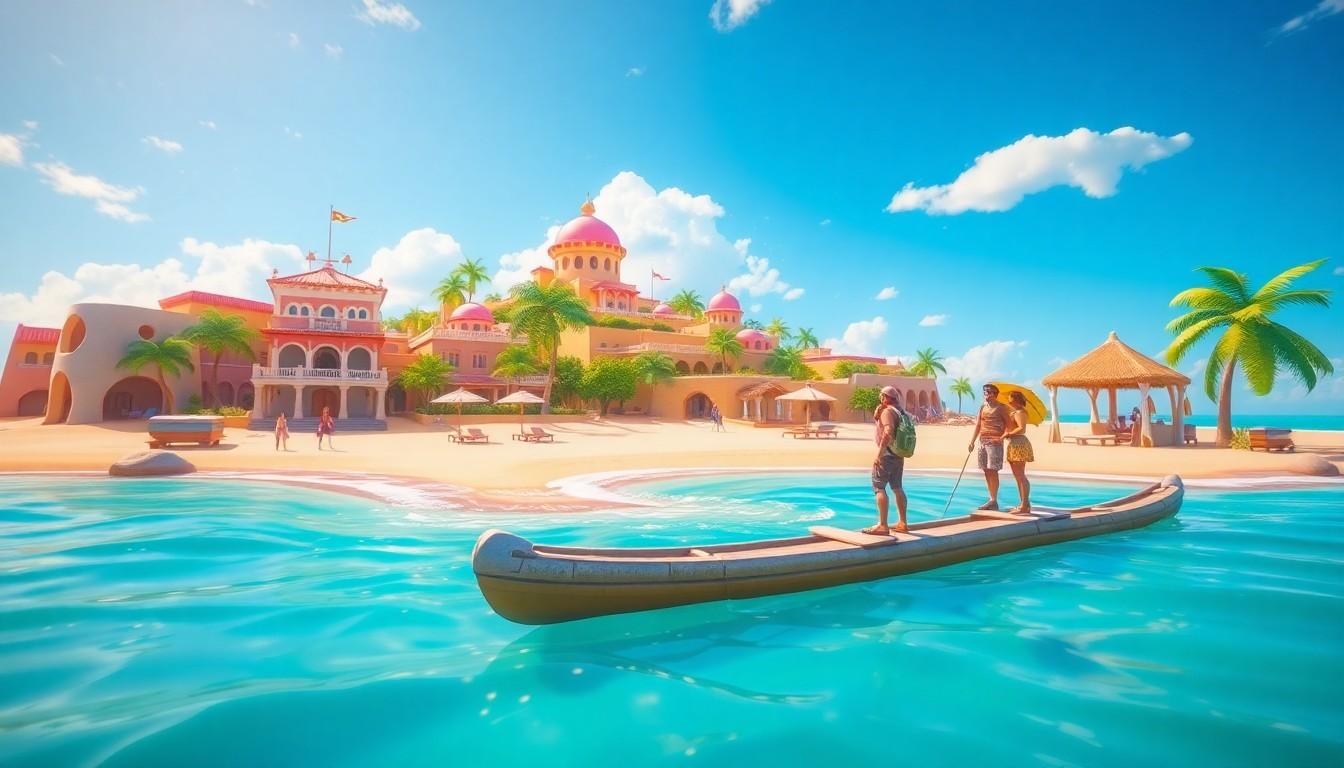 Fortnite’s vibrant visuals create an inviting atmosphere where players can immerse themselves in a sunny environment. Bright colors and lively landscapes dominate, showcasing the game’s artistic appeal.
